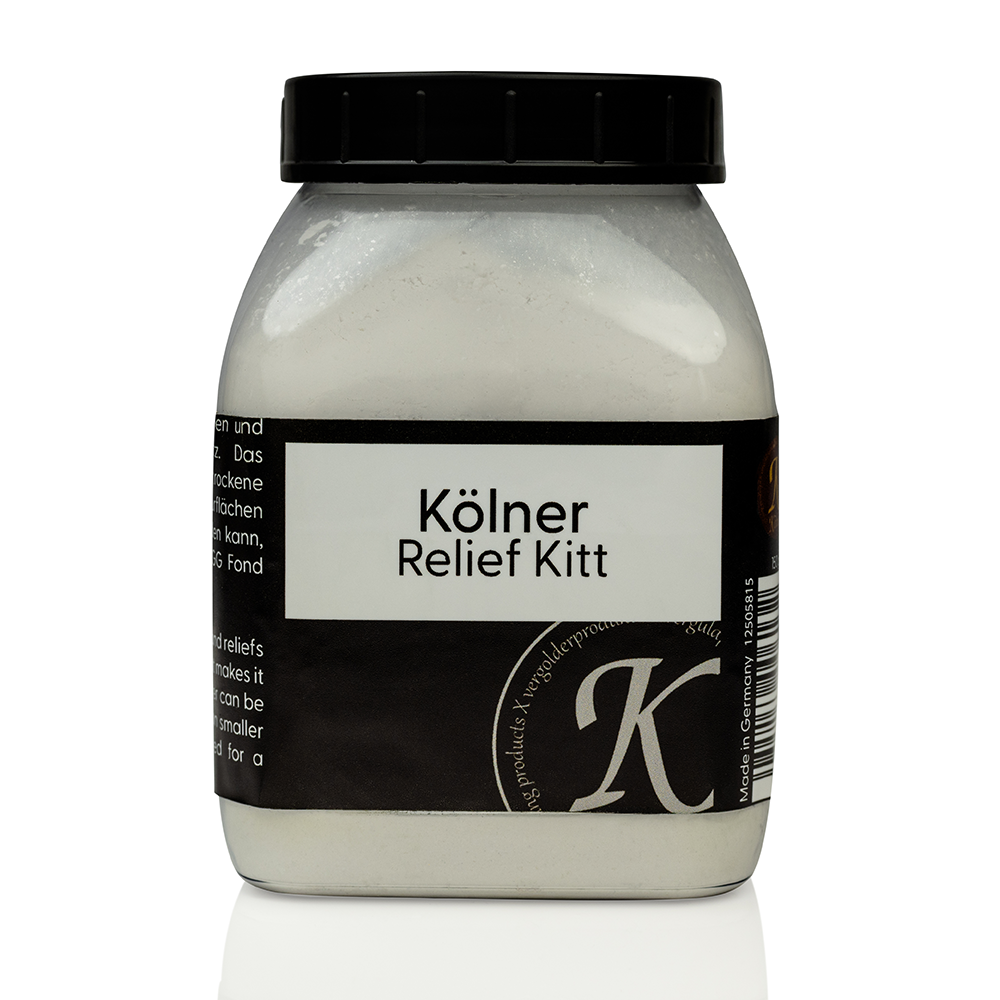 Reparaturmasse für Bilderrahmen und Relief aus Gips oder Holz. Das Besondere ist, dass der trockene Reliefkitt bei kleineren Reparaturflächen direkt polimentvergoldet werden kann, ohne das ein Aufbau mit KGGG Fond notwendig ist.